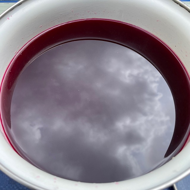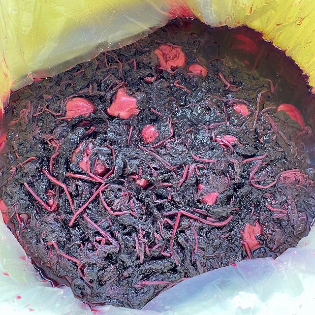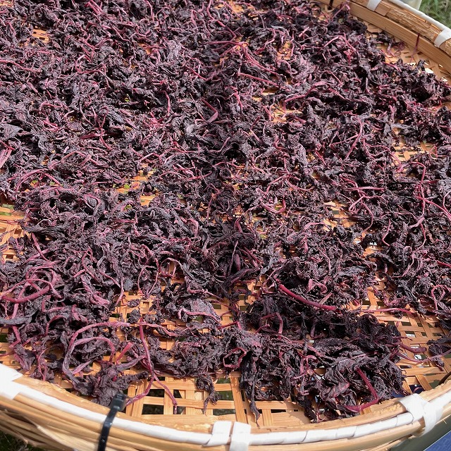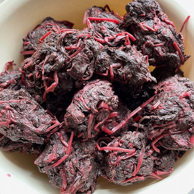 京都市左京区大原から塩漬けもみ紫蘇が届きましたので、樽にもみ紫蘇を投入します。