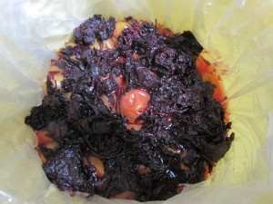 京都市左京区大原から塩漬けもみ紫蘇が届きましたので、樽にもみ紫蘇を投入します。