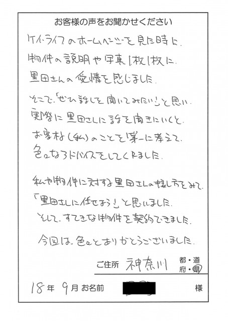 この度、ご子息のご入学のため、広島県からお越しくださいました。ご来店いただいた水曜日は不動産会社の定休日となるため、リアルタイムの物件状況、情報の確認が取れない場合がございましたが、この日しかご都合が合わないということでしたので、事前に物件情報を確認し水曜日を迎えました。ご希望の条件をお聞かせいただき、大学に通いやすい物件をご紹介させていただき...