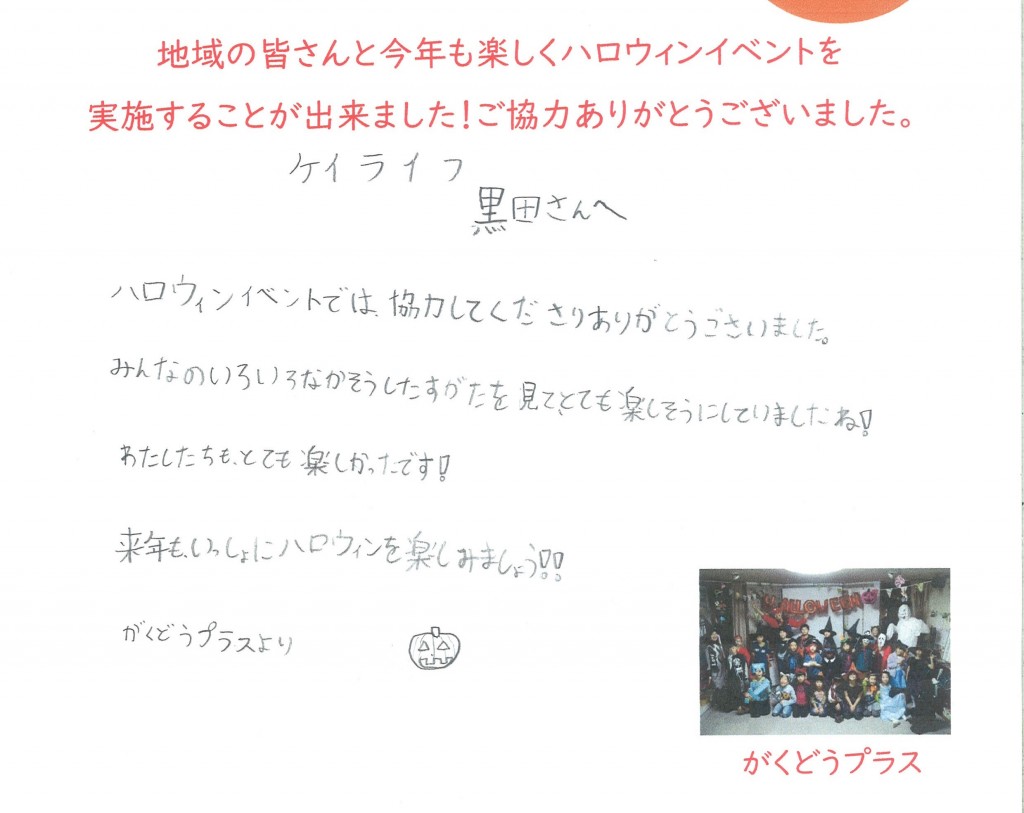 がくどうプラスさんへ通う子供たちと先生がハロウィンのお礼にとケイ・ライフまでお越しくださいました。