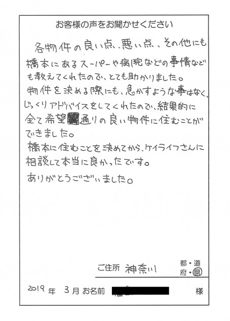 お引越しの原因は虫でした。ご相談をいただいた時はできるだけお引越しをしないで済むように虫駆除のアドバイスをさせていただきました。お引越しにはお金がかかりますからね。するとだんだん虫が出なくなって来たので、引越しをしなくてもいい状態になりましたが、「何かいい物件があったら教えてください。」ということで、いい物件をご紹介させていただきました。ご契約金が安くなるとい...