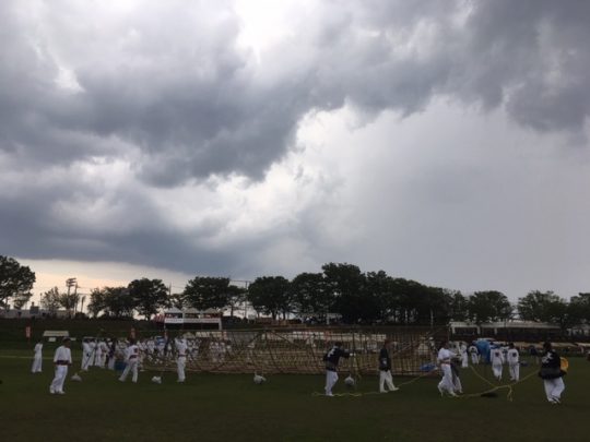 雨がポツポツと降ってきたので、急いで大凧の紙を外します。
