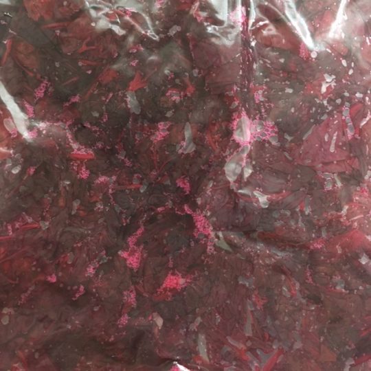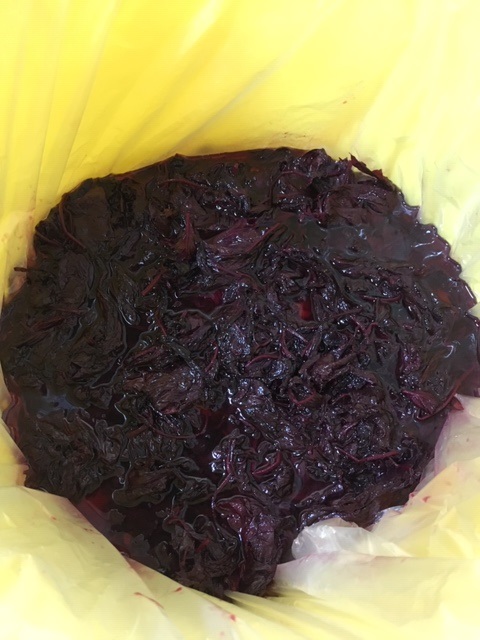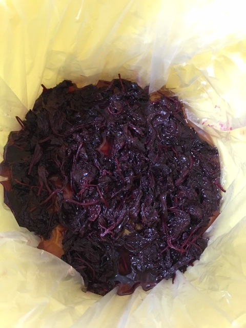 京都市左京区大原から塩漬けもみ紫蘇が届きましたので、樽にもみ紫蘇を投入します。