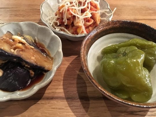 左から揚げ茄子しょうが、はじめのマカロニサラダ、まるごとピーマン
