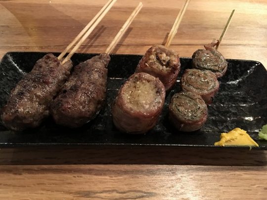 A5黒毛和牛のつくね串、えのき肉巻き、大葉肉巻き