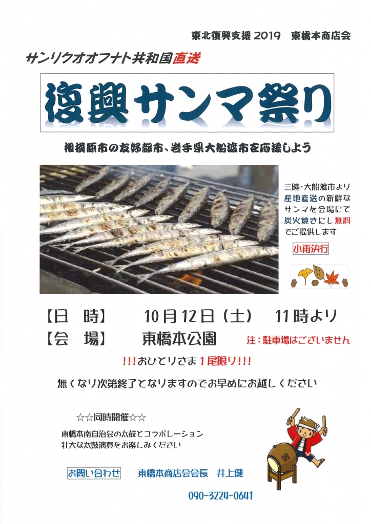 大船渡市復興支援のため、東橋本商店会から、お客様へ日頃の感謝の気持ちを込めて、無料でさんまを召し上がっていただきます!