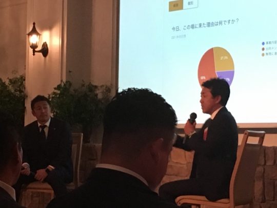 日本YEG内田直前会長が壇上に上がり、会場にいる仲間のLIVEアンケートの結果や質問事項を見ながらYEGについて語ってくださいました。