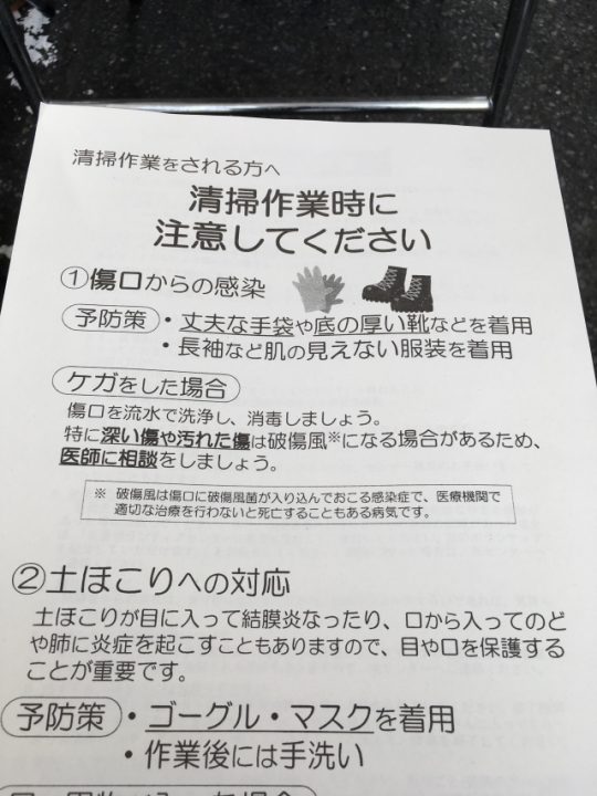 土砂の中の細菌が体内に入らないよう目、口を保護するため、ゴーグルやメガネ、マスクを着用してください。
