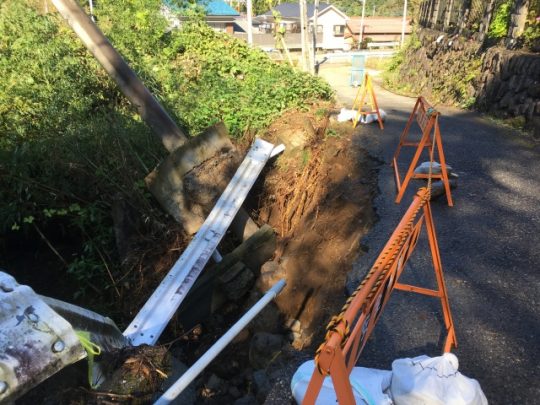 道路と一緒にガードレールが崩れ落ち、電柱も倒れてしまっています。