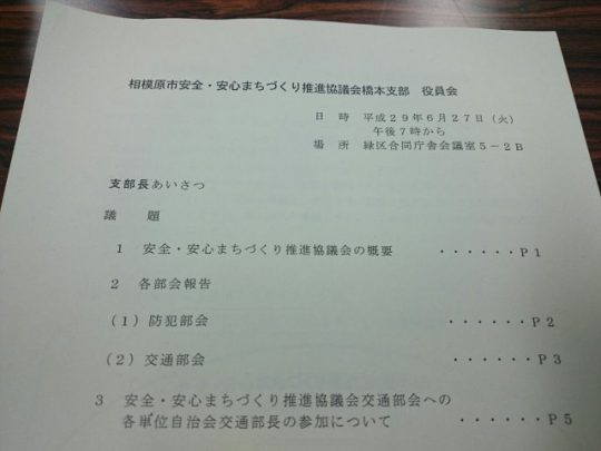 今夜は相模原市安全・安心まちづくり推進協議会橋本支部の役員会に出席いたしました。