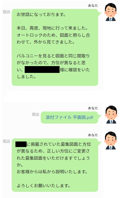 私は間取りが反転、もしくは方位が反転しているのかも知れないと思い、マンション全体の管理会社へ問合せをして平面図を取得し、お部屋の管理会社へ連絡いたしました。