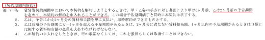 第7条 賃貸借契約期間内において本契約を解約しようとするときは、甲・乙各相手方に対し書面により甲は6ヶ月前、乙は2ヶ月前の予告期間を定めて、本契約の解約を申入れることができる。この場合予告期間満了と同時に本契約は終了する。