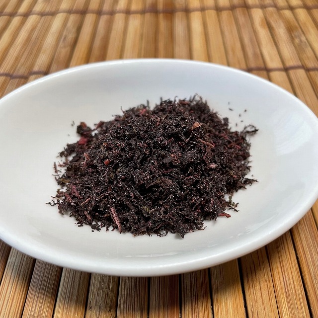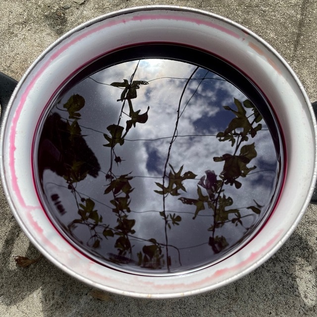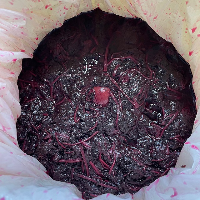 京都市左京区大原から塩漬けもみ紫蘇が届きましたので、樽にもみ紫蘇を投入します。